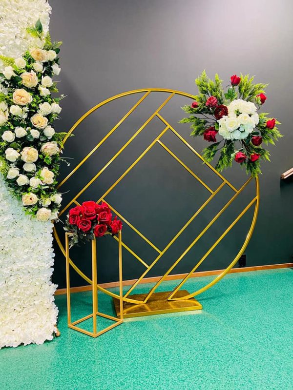 Hire our New style gold backdrop for $100/Day . Floral decoration and balloon garlands can be added for extra .